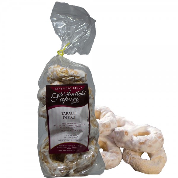 I Taralli Dolci con glassa di zucchero: a partire dal 1848 questi biscotti sono diventati il fiore all’occhiello della tradizione gastronomica di Castellammare di Stabia, una florida località sita in provincia di Napoli. Probabilmente, questi “tarallini” di pasta dolce e ricoperti di glassa, devono il loro nome tradizionale di “anginetti” ai re della dinastia Angiò, «importatori di artisti e nuove costumanze» che, agli inizi del Trecento, fecero di Napoli la capitale politica, economica e culturale del Regno di Sicilia. I Taralli Dolci con glassa di zucchero sono ormai spariti dalle pasticcerie ma si possono trovare, molto raramente, solo in qualche panificio come quello Antichi Sapori di Bellizzi (Sa). Giovanni e Vittorio Ricca, “maestri fornai”, li hanno inseriti nell’accurata selezione di prodotti di altissima qualità da destinare ad Amanti Events. I Taralli Dolci con glassa di zucchero nascono da un impasto detto”sciocco” perchè fatto di semplici ingredienti: uova,zucchero,farina, olio d’oliva e sale. E’ dall’unione di questi ingredienti che viene fuori un impasto elastico e tenace, a cui viene data la forma di un piccolo nodo o ciambellina. La sola ricchezza di questo biscotto è il “naspro”,ossia una glassa fatta di acqua,zucchero e limone: una copertura deliziosa che rende l’impasto un pò insipido,ricco e prelibato.