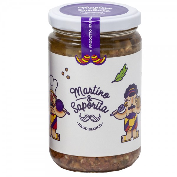 Sugo pronto al ragù bianco a lavorazione artigianale dall'azienda a conduzione familiare Martino & Saporita, pronto all’uso e unico sul mercato, contenente carne suina stagionata proveniente da aziende lucane certificate, funghi, ortaggi e verdure del Cilento. Caratterizzato da un gusto deciso e versatile, è possibile utilizzarlo in cucina liberando la fantasia del cuoco per ogni tipologia di ricetta! Pasta pronta in pochi istanti mantecando in padella per qualche secondo, pizza, baguette, bruschette e panini di ogni genere. Si sposa alla perfezione con prodotti di alta qualità, esaltandone i sapori per un esplosione di gusto inconfondibile!